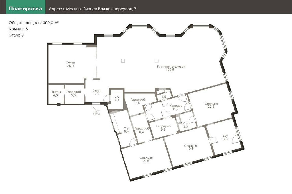 ID 20824 Предлагается 5-комнатная квартира в клубном доме на 8 апартаментов в тихих переулках Арбата. Интерьер квартиры выполнен в современном стиле с использованием натуральных качественных материалов. Квартира полностью укомплектована мебелью, оборудована современной бытовой техникой от ведущих мировых производителей и готова к проживанию. Функциональная планировка включает в себя кухню, гостиную-столовую, 3 спальни с собственными гардеробными и ванными комнатами, кабинет, гостевой санузел, постирочную. Из панорамных окон открываются виды на переулки и особняки старой Москвы. 2 машиноместа в подземном паркинге входят в стоимость.